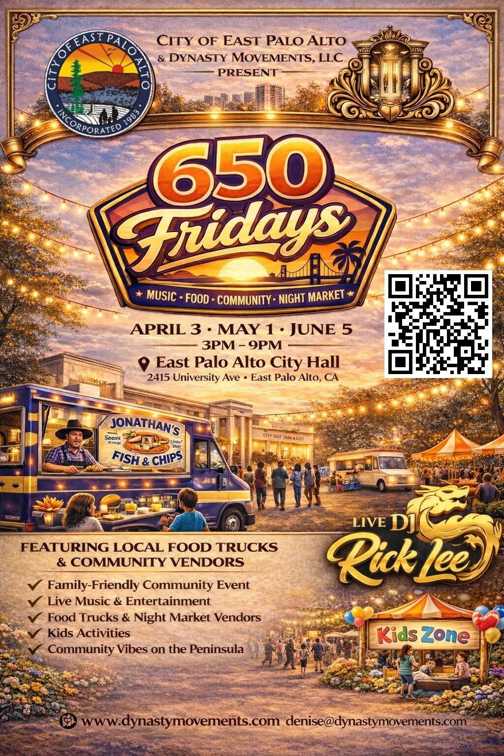 Multiple DatesMay 01, 2026, 3:00 PM – 9:00 PMEast Palo Alto City Hall, 2415 University Ave, East Palo Alto, CA 94303, USAJoin the City of East Palo Alto and Dynasty Movements in a night market featuring food, live music, and community.