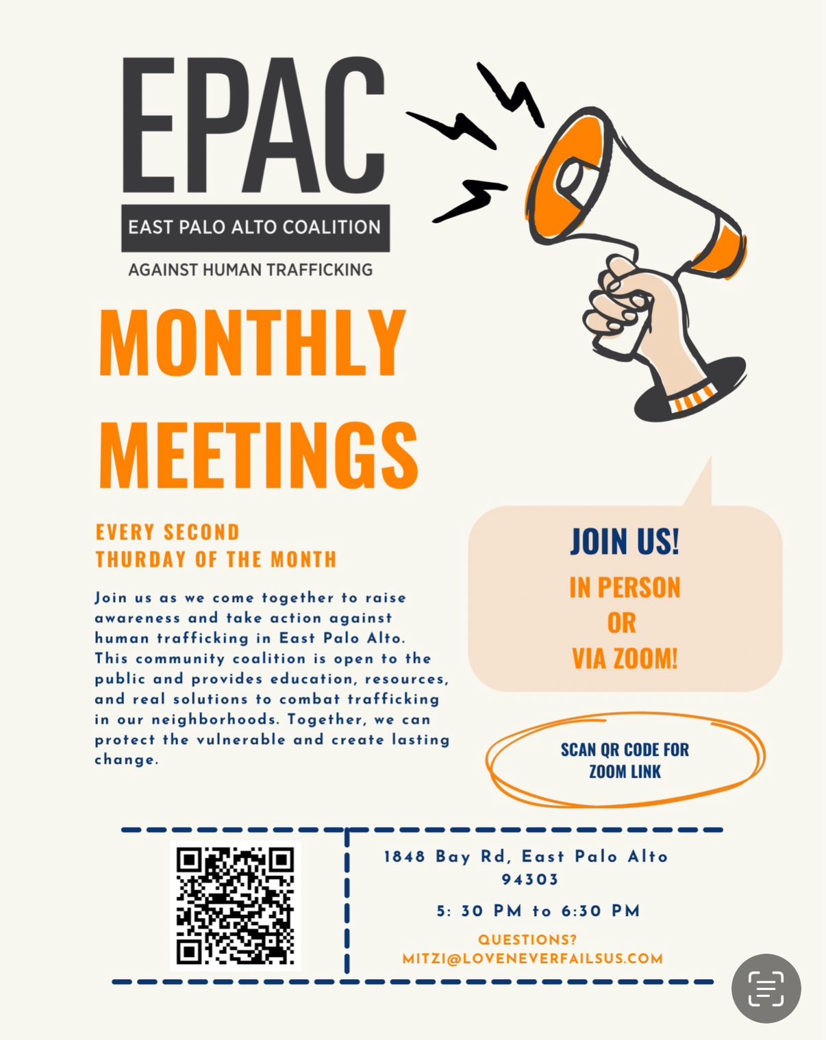 - Multiple DatesOct 09, 2025, 5:30 PM – 6:30 PM1848 Bay Road, EPA, 1848 Bay Rd, Palo Alto, CA 94303, USAJoin your community in raising awareness and taking action against human trafficking in East Palo Alto. These meetings are ope to the public. Come learn how to protect the vulnerable and create lasting change.
